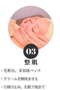 例)wクレンジング→お肌診断→美容機器で汚れ落とし→手技によるリンパマッサージ→化粧水パック→美容液導入→整肌